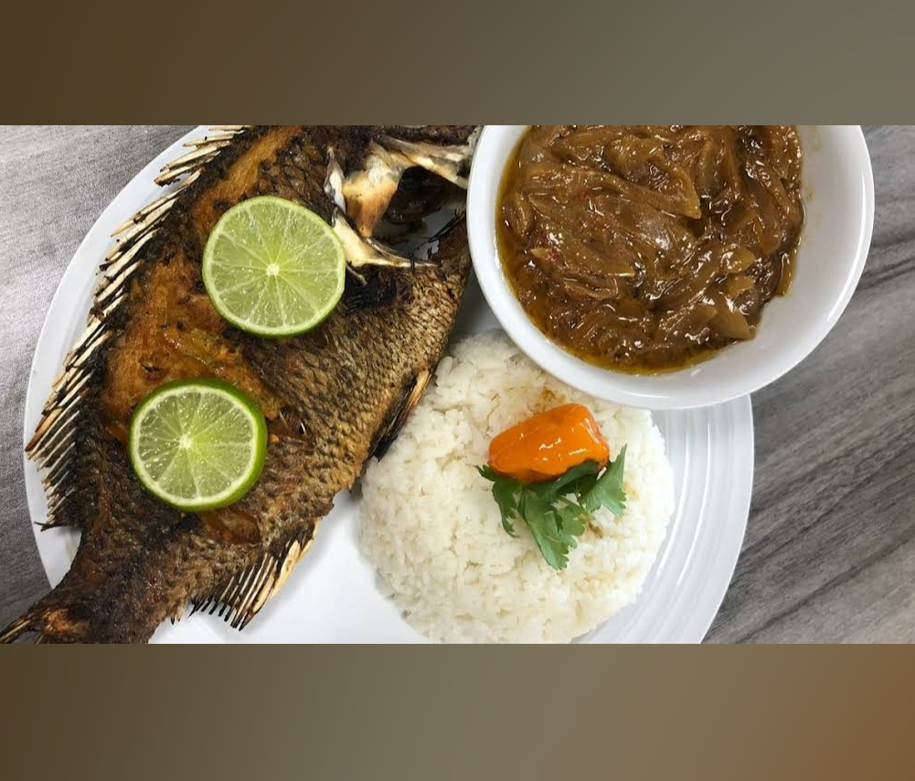 Grilled tilapia, citrusy onion sauce, spinach and okra chutney, palm oil, served with rice